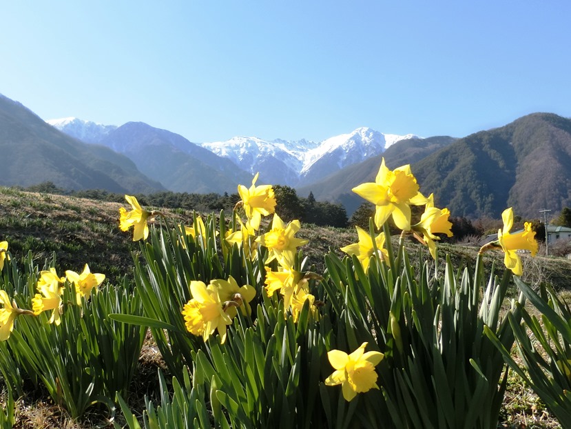 残雪のアルプスを背景に、水仙が咲き始めておりました。