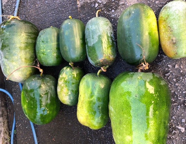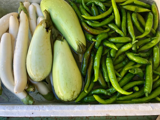 左から、白ナス・翡翠(ひすい)ナス・甘長唐辛子