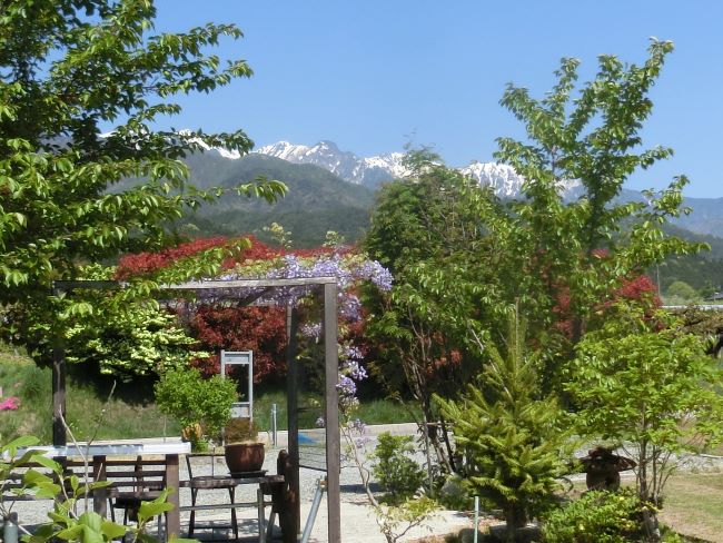 新緑と藤棚の花房が遠山の残雪を背景に目を和ませてくれています。