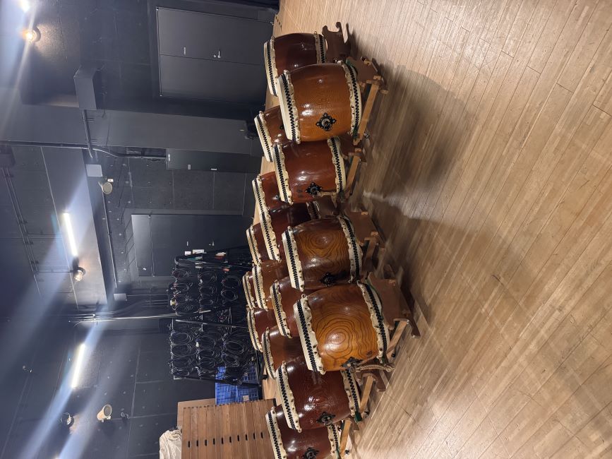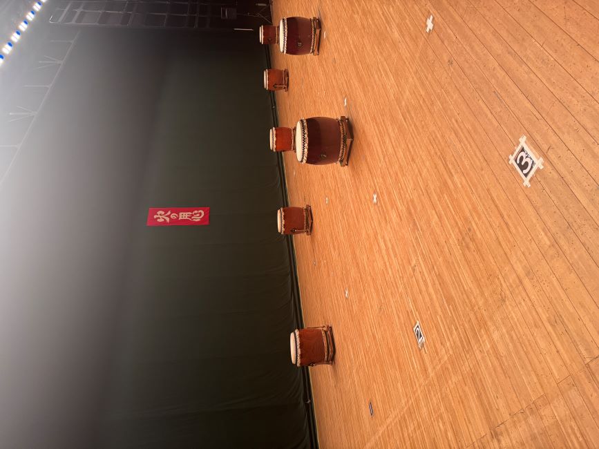 舞台袖では太鼓をこのように並べて音の鳴りを確認して番号を振り、