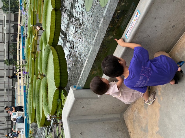 オオオニバスが浮いている水槽の中の小魚の群れを