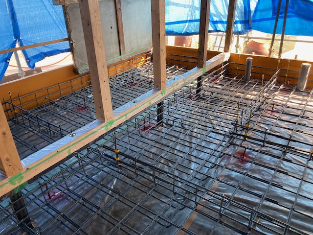 防湿シートを敷き 鉄筋の組立 土間止枠 アンカーボルトの設置などなど