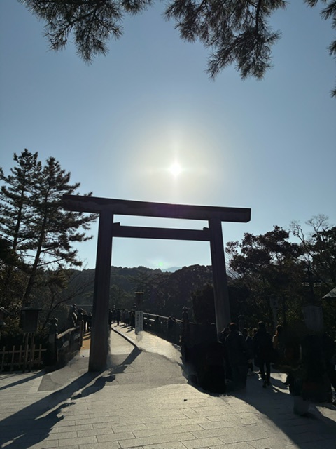 内宮宇治橋の真ん中辺りから日の出が大鳥居の中央に納まる瞬間を