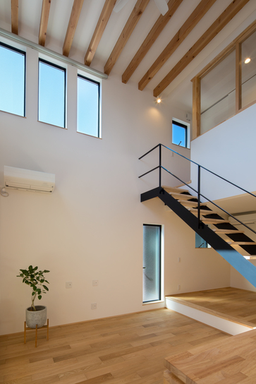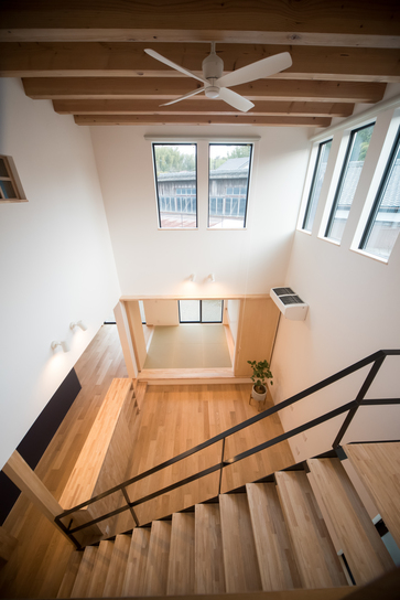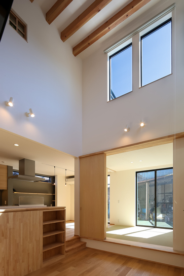 2Fへ続く階段がある高い天井のリビングや小上がりによって、
