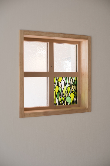 お施主様のご趣味のステンドグラス作品を取り入れた窓やドアをつくり、