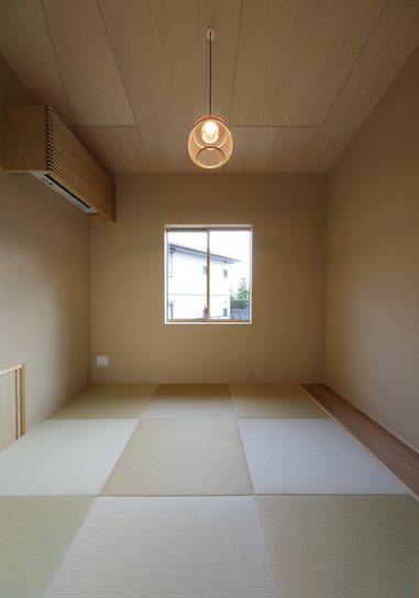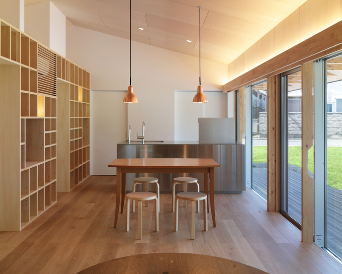 将来雑木林のように育つ庭を臨み、真夏の酷暑と明るすぎる室内を避けて北向きに大きな窓を開き、