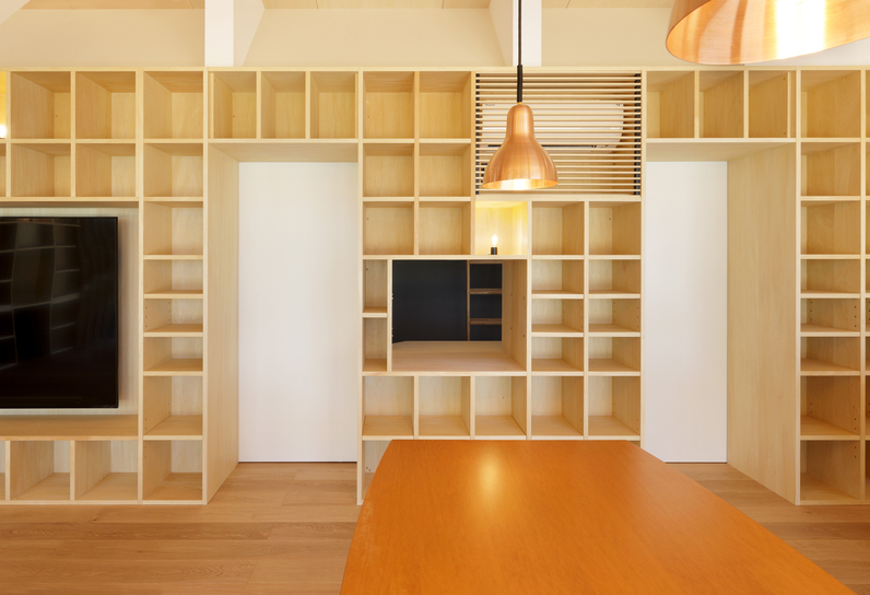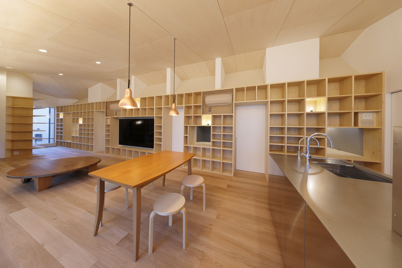 各々の気配が感じられるよう本棚に空けられた窓や、皆でバスケットボールを観戦する大きなテレビ、