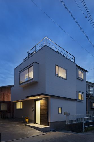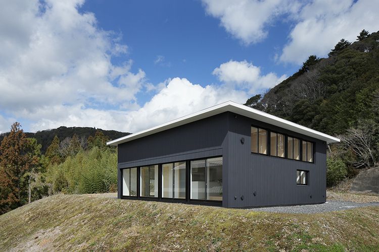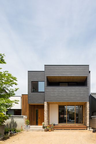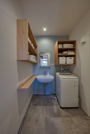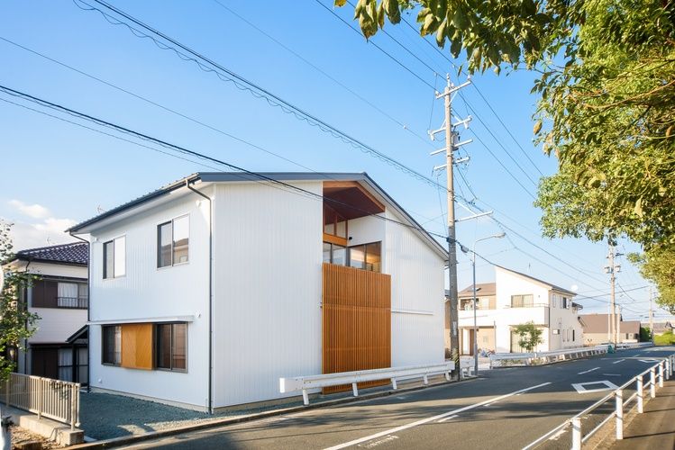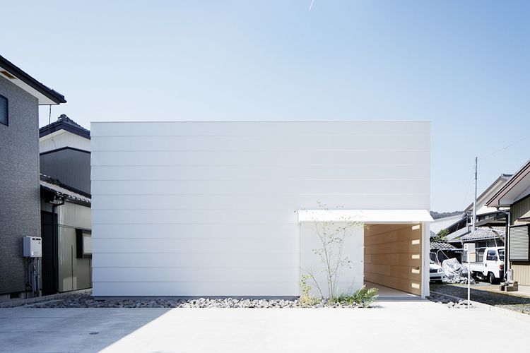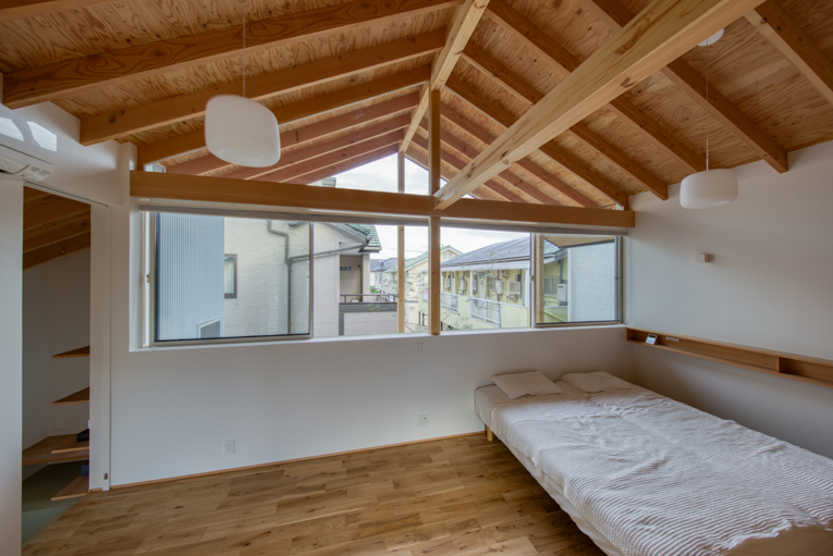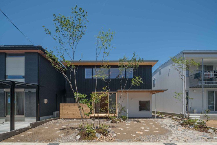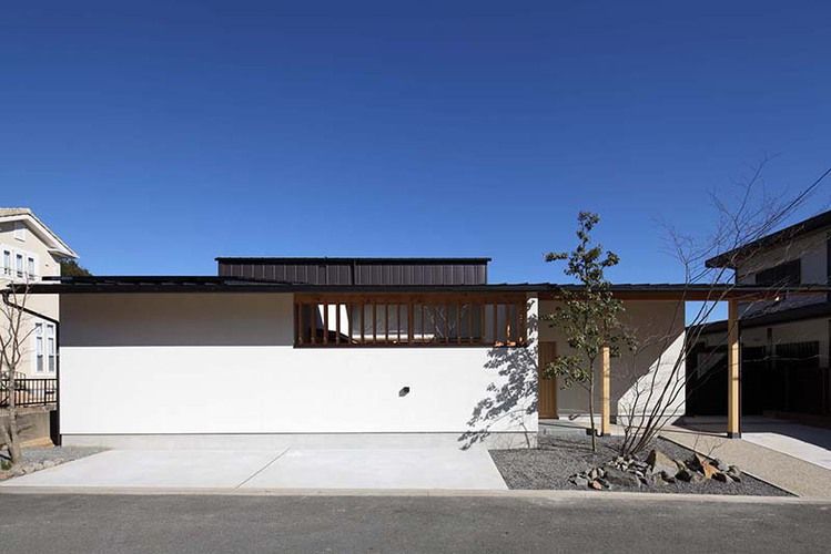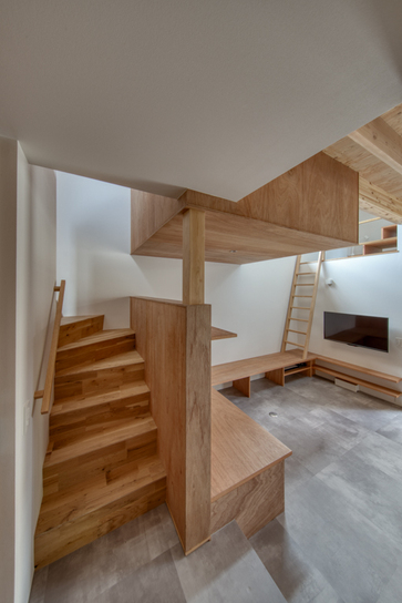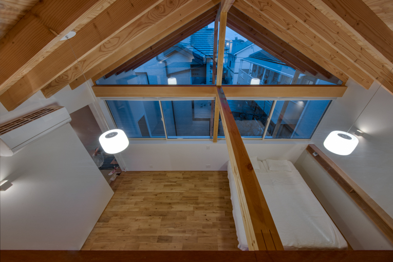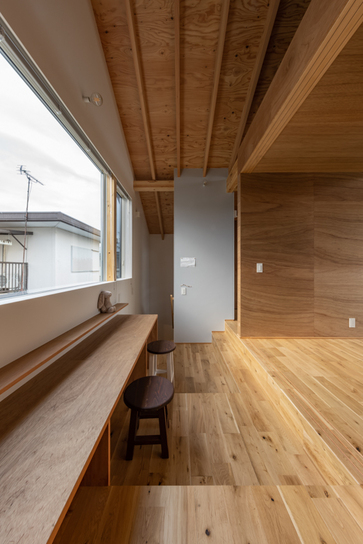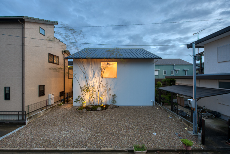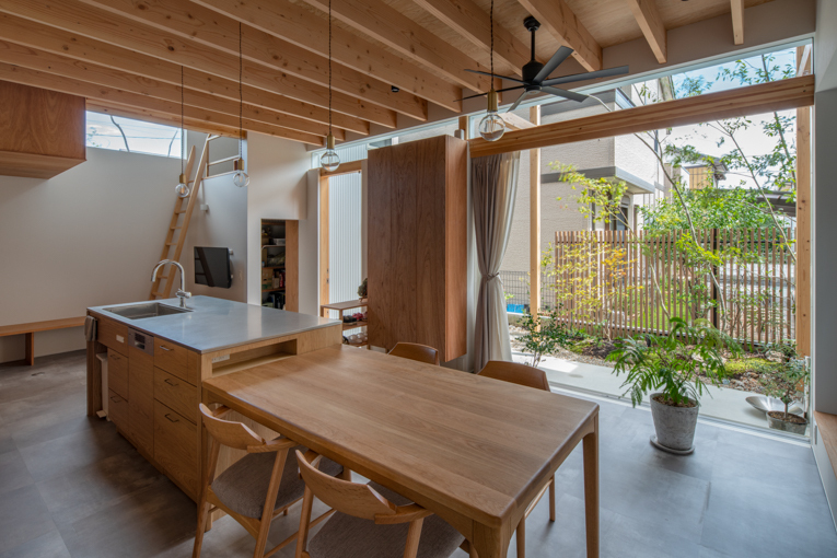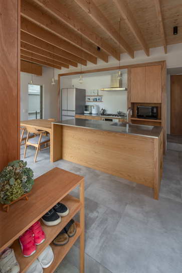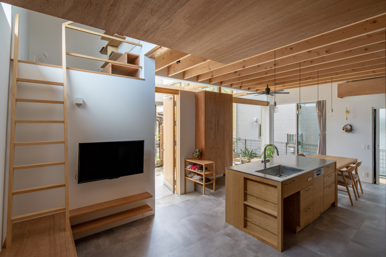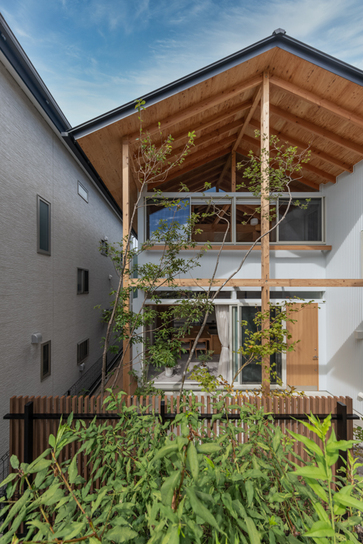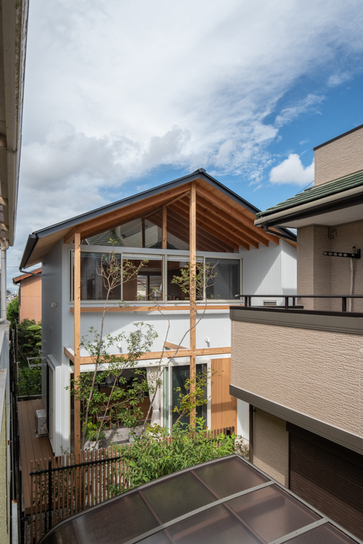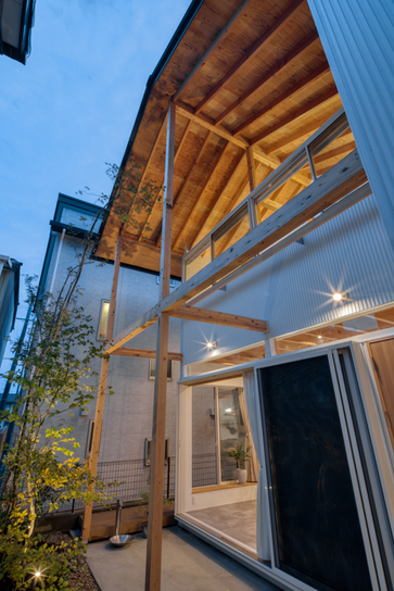建物形状も旗竿形状とする事で屋根の掛かった半屋外空間(土間テラス)つくり出した。