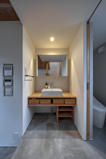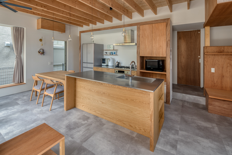 この半屋外空間は玄関ポーチやリビングと一体利用ができるテラスの役割も兼ねており、